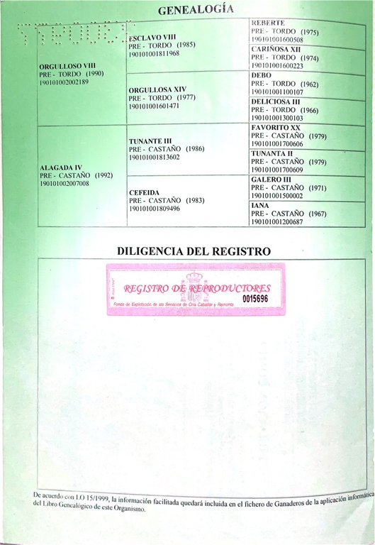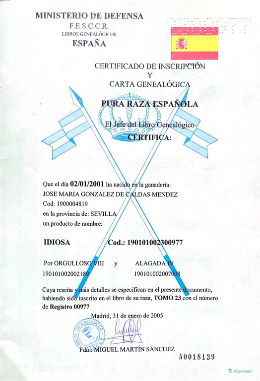 Idiosa desciende de una genealogía completamente Pura Raza Española. Su padre, Orgulloso VIII, y su madre, Alagada IV, encabezan un árbol genealógico donde el PRE aparece en cada generación, con líneas que se remontan a los ejemplares más representativos de la raza: Tunante III, Galero III, Orcullosa XIV y Favorito XX, entre otros.